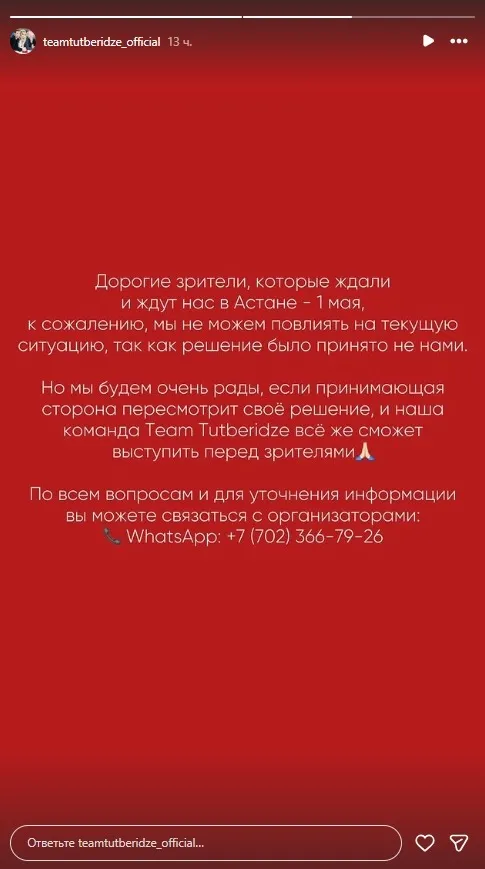 "Дорогие зрители, которые ждали и ждут нас в Астане 1 мая, к сожалению, мы не можем повлиять на текущую ситуацию, так как решение было принято не нами. Но мы будем очень рады, если принимающая сторона пересмотрит свое решение и наша команда Team Tutberidze все же сможет выступить перед зрителями".