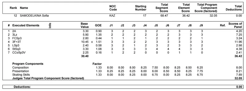 Детализация судейских оценок Софы за короткую программу выглядит следующим образом: