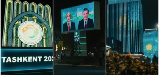 Судя по кадрам, улицы Ташкента и высотные здания украсили флагами Казахстана и Узбекистана, а LED-экраны – фотографиями Касым-Жомарта Токаева и Шавката Мирзиёева.