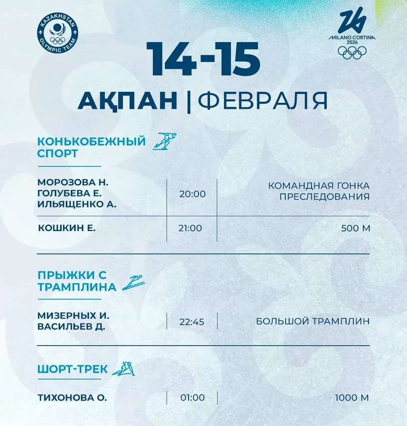 По информации Национального Олимпийского комитета, в субботу на Олимпийских играх в Италии Казахстан в семи видах спорта представят 17 спортсменов. Начало соревнований указано по казахстанскому времени.