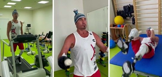 На кадрах Костомаров занимается спортом, не обращая внимания на протезы. Бежит по беговой дорожке, делает сгибание на бицепс, махи для проработки плеч, а также выполняет скручивания.