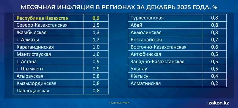 В целом же минимальные значения месячной инфляции в ряде областей (Западно–Казахстанская, область Улытау – по 0,5%) показывают, что при грамотной логистике и контроле рынков цены могут "тормозить" даже в период повышенного зимнего спроса.