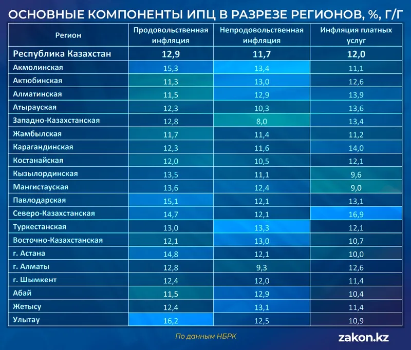 Самый высокий показатель зафиксирован в Северо-Казахстанской области – 14,3%. В группу регионов с повышенной инфляцией также вошли Акмолинская, Павлодарская, Туркестанская области, область Улытау, Карагандинская, Алматинская и Мангистауская области.