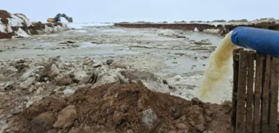Приближаемся к причине ухода воды – водоотводному каналу. Его начали строить осенью 2024 года, когда стало понятно, что разлившиеся пять озер не вернутся в прежние границы без вмешательства человека.