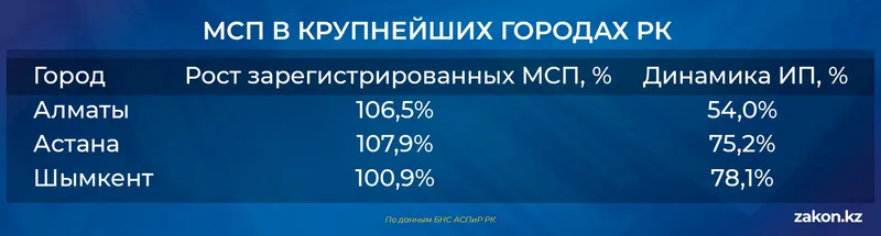 Этот сдвиг особенно заметен в крупнейших городах. Так, в Алматы зарегистрировано около 448 тысяч субъектов МСП, в Астане – более 305 тысяч. За год количество зарегистрированных малых и средних предприятий (МСП) в столице выросло на 7,9%, в Алматы – на 6,5%.