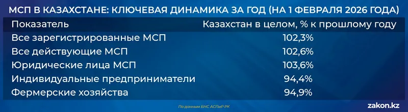 По состоянию на 1 февраля 2026 года в стране зарегистрировано 2,33 млн субъектов малого и среднего бизнеса, из которых около 2,15 млн реально работают. В годовом выражении это означает рост на 2,3% и 2,6% соответственно, сообщает Zakon.kz.