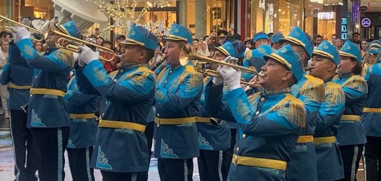 В ТРЦ первыми собравшихся порадовал Образцово-показательный оркестр Национальной гвардии Казахстана. Участники оркестра исполнили произведения Адиля Бестибаева "Жорга", "Батырлар ұраны" группы "Алаш" и "Мен қазақпын" Ерболата Кудайбергенова. Слушатели, благодарные за поднимающие дух мелодии, не жалели аплодисментов. Концерт проходил на первом этаже, однако зрители наблюдали за перфомансом со всех этажей здания.