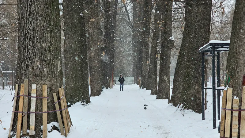 После ночного снегопада пространство в роще Баума словно замерло. Деревья стоят неподвижно, укутанные в белый иней, а тропы потеряли привычные очертания. Снег лег ровным покрывалом и будто приглушил все звуки. В этой тишине роща кажется оторванной от городского ритма – спокойной, сдержанной и почти безлюдной, словно пережидающей зиму в ожидании долгожданной весны.