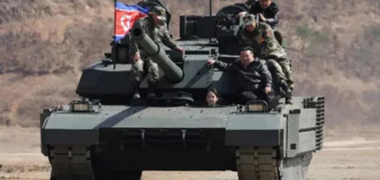 На новых фото он находится на танке, рядом с ним сидит его дочь. На технике установлен государственный флаг КНДР.