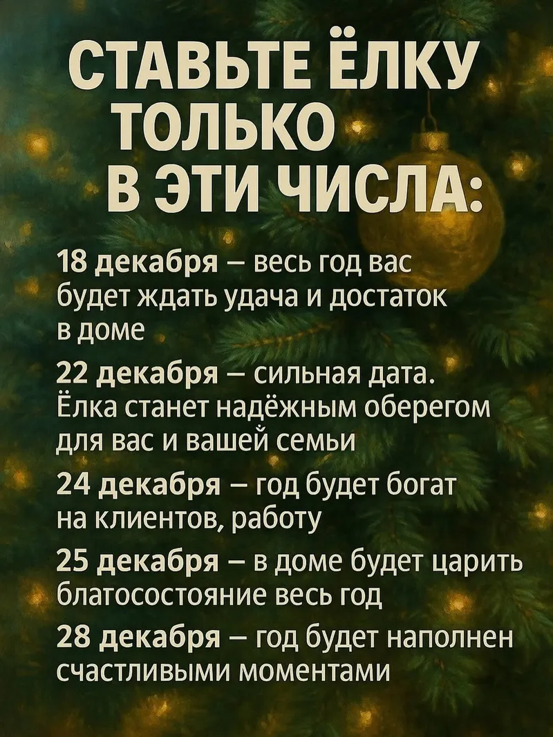 Специалисты, опираясь на нумерологию и астрологические прогнозы, выделяют в декабре 2025-го несколько дней, обладающих сильной энергией. Говорят, если ставить елку в определенные даты, можно приманить удачу, успех на работе или личное счастье. В соцсетях часто попадаются вот такие рекомендации.