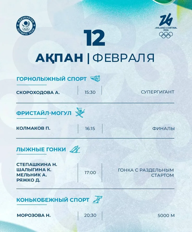 Стало известно, кто из Олимпийских спортсменов и в каких видах спорта проявит себя на стартах 12 февраля, сообщает Zakon.kz.