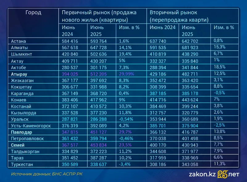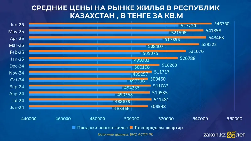 Согласно данным Бюро нацстатистики, в июне 2025 года средние цены на первичное жилье выросли на 1,07% по сравнению с маем и составили 527 220 тенге, рынок перепродажи квартир (вторичное жилье) – на 0,9% до 546 730 тенге. В годовом выражении цены выросли на 7,9% и 7,3% соответственно. При этом в разрезе городов динамика была неоднородной.