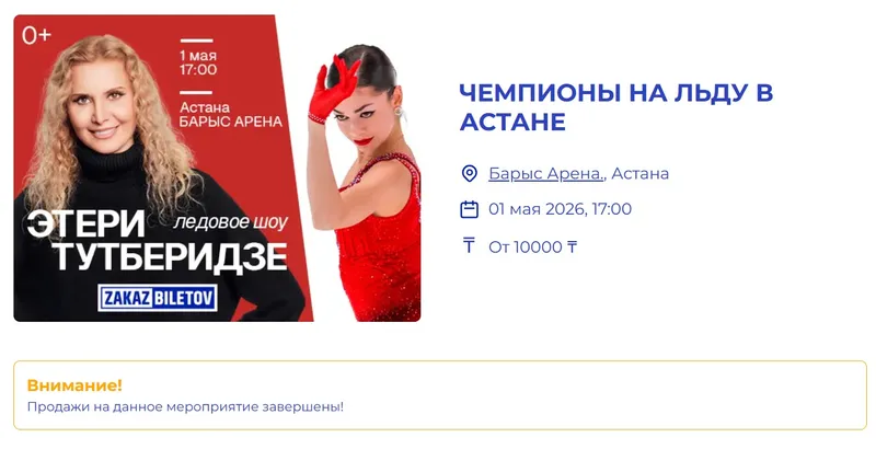 1 мая 2026 года в Астане должно было пройти ледовое шоу заслуженного тренера России по фигурному катанию на коньках Этери Тутберидзе под названием "Чемпионы на льду". Однако сегодня, 1 апреля, стало известно об его отмене, сообщает Zakon.kz