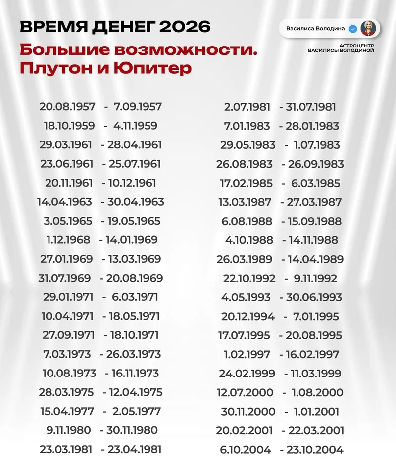Известный российский астролог Василиса Володина накануне, 4 декабря 2025 года, опубликовала в своем Instagram даты рождения счастливчиков, у которых в следующем году появится шанс стать богаче, сообщает Zakon.kz.