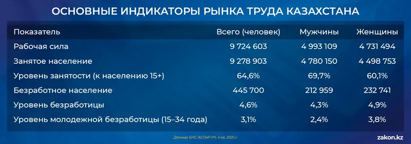 Рынок труда Казахстана демонстрирует редкую для переходных экономик картину – высокая занятость при низкой безработице. По данным статистики, численность рабочей силы достигла 9,72 млн человек, из которых заняты 9,28 млн. Безработица удерживается на уровне 4,6%. сообщает Zakon.kz.