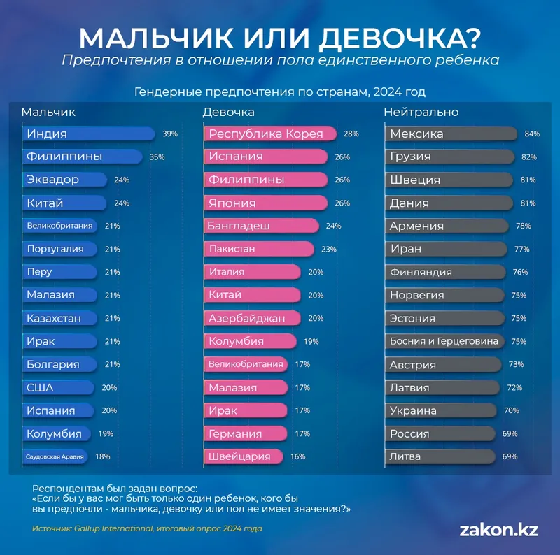 Казахстан в этом списке занимает 9-е место, где тоже каждый пятый ответил, что отдает предпочтение именно мальчикам.
