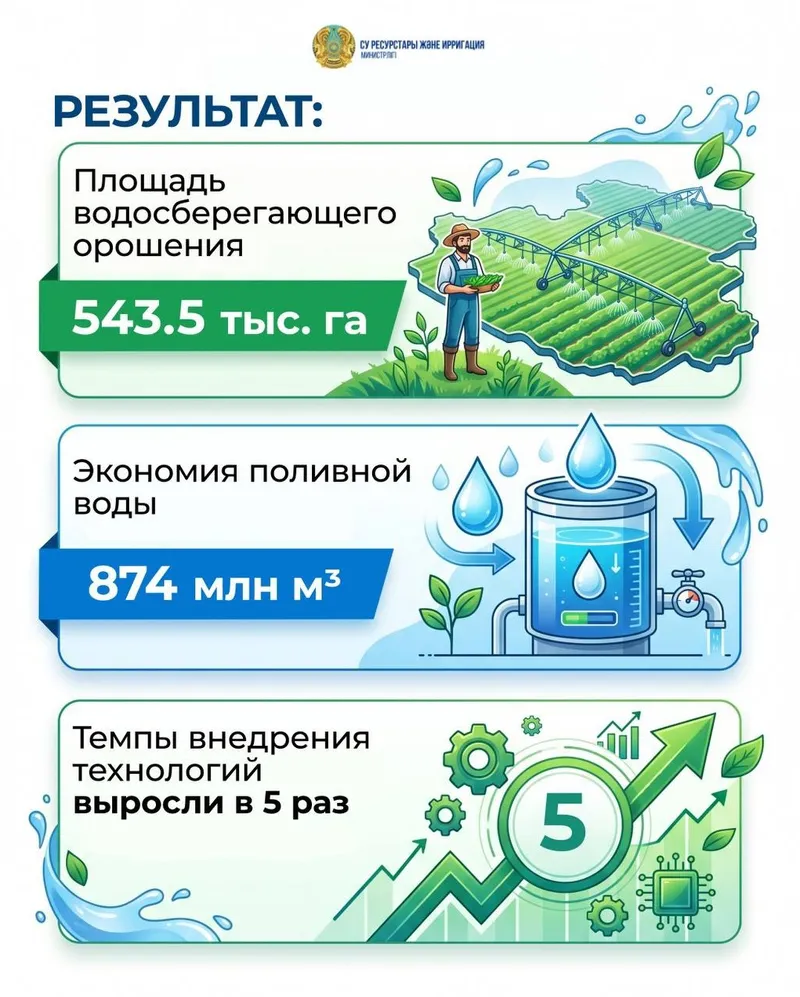 Принятые меры уже приносят результаты. Государственная поддержка позволила в пять раз ускорить темпы внедрения водосберегающих технологий орошения в Казахстане. По итогам 2025 года площадь применения таких систем составила 543,5 тыс. га, что позволило сэкономить 874 млн м³ поливной воды.