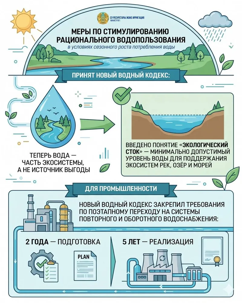 Для этого ведомством разрабатываются и принимаются меры, направленные на обеспечение эффективного водопотребления в отраслях экономики. Так, в прошлом году был принят новый Водный кодекс, передает пресс-служба министерства.