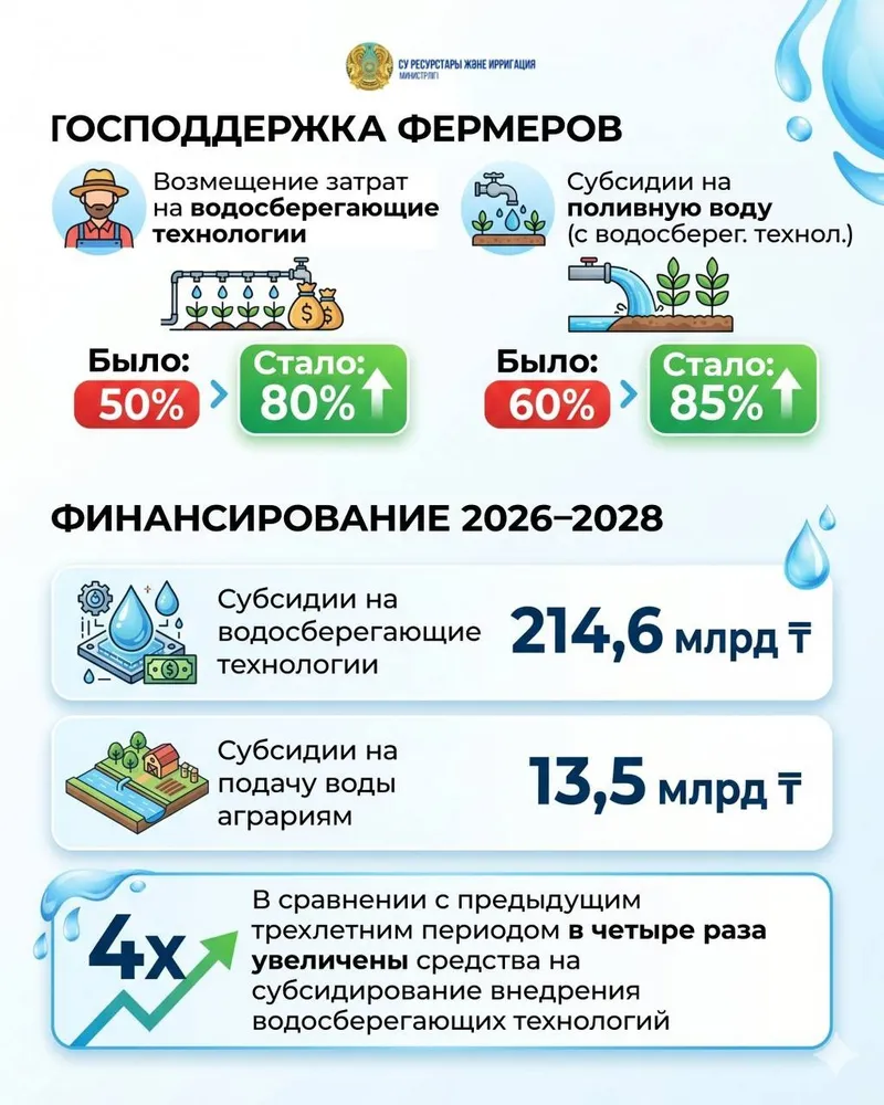 На 2026-2028 годы в сравнении с предыдущим трехлетним периодом в четыре раза увеличены средства на субсидирование внедрения водосберегающих технологий. Теперь они составляют 214,6 млрд тенге. А на субсидирование стоимости услуг по подаче воды сельхозтоваропроизводителям выделено 13,5 млрд тенге.
