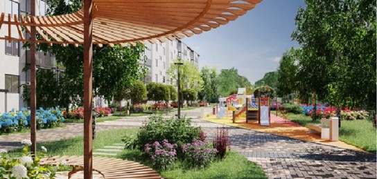 Важно предусмотреть возможность передвижения по территории родителей с колясками, лиц с ограниченной возможностью, пенсионеров. Для этого линии тротуаров делают плавными, бордюры оснащают пандусами, ступенями. Фасад дома предлагают обновить, железные двери заменить на стеклянные.