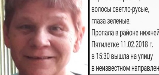 Напомним, 11 февраля в 15.30 час. Вера Печенкина, 01.07.1954 г.р., в районе Нижней Пятилетки вышла из дома в неизвестном направлении и пропала. Она была одета в зеленое платье, сапоги чёрные, полушубок темно бордовый, серую шапку. Рост 160 см., коротко подстрижена, глаза зеленые. У женщины болезнь Альцгеймера. Последний раз ее видели по ул. Харьковской.