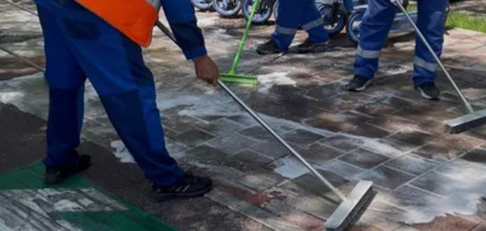 Процесс очистки организован поэтапно: сначала тротуары обрабатывают водой с моющим раствором, затем загрязнения убирают вручную с помощью щеток, а на завершающем этапе поверхности промывают чистой водой.