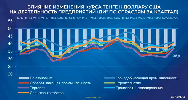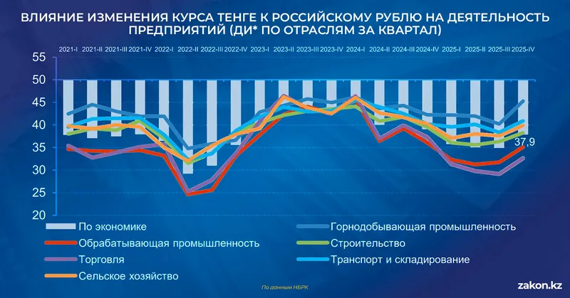 По итогам IV квартала 2025 года диффузионный индекс (ДИ) влияния курса тенге к российскому рублю составил около 41 пункта по экономике. В горнодобывающей промышленности – порядка 43, в обрабатывающей – 38, в торговле – 36, в транспорте и складировании – около 40, в сельском хозяйстве – 37,9.
