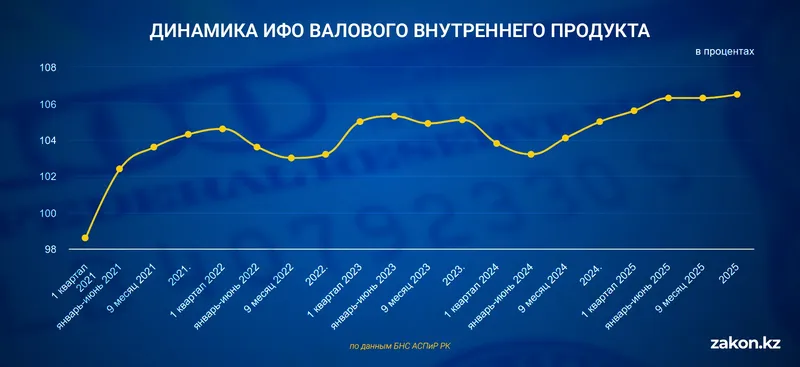 В динамике последних лет экономика Казахстана прошла несколько этапов. В 2020 году был зафиксирован спад на 2,4% на фоне пандемии и ограничительных мер. Начиная со второго квартала 2021 года экономика перешла к восстановлению, после чего рост сохранялся и в 2022–2024 годах.