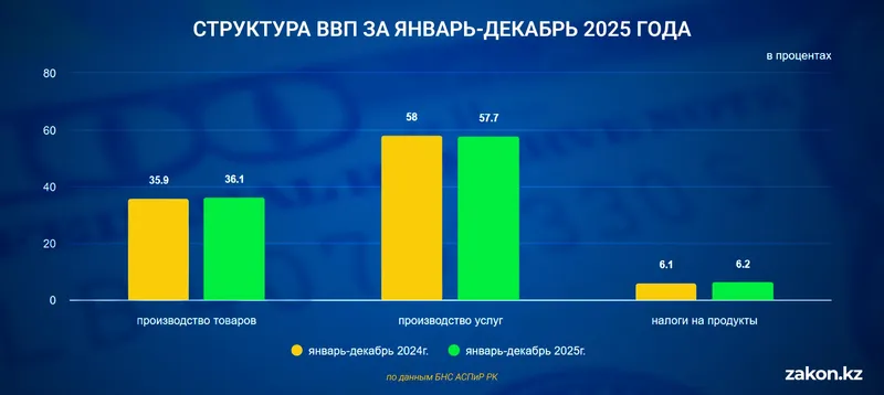 По итогам года доля производства услуг в ВВП составила 57,7%, производства товаров – 36,1%, налогов на продукты – 6,2%.