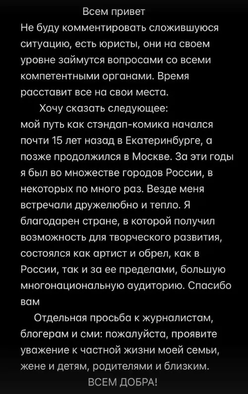 В конце он обратился к журналистами и блогерам с просьбой проявить уважение к частной жизни жены, детей, его родных и близких.