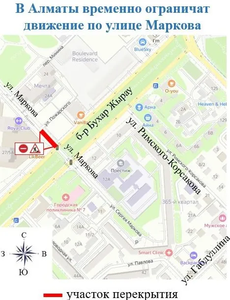 "С 21:00 27 мая до 07:00 28 мая движение автотранспорта будет временно ограничено на участке улицы Маркова – от бульвара Бухар Жырау до улицы Пожарского. В обоих направлениях".