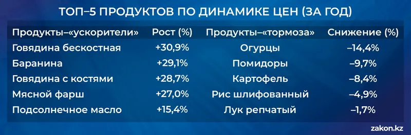 Редакция Zakon.kz проанализировала свежие данные статистики и выяснила, какие продукты продолжают "кусаться", а какие позволяют казахстанцам существенно экономить.