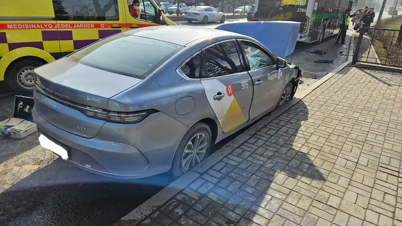 После BYD столкнулся с автобусом и остановился у остановки. Благодаря высокому бордюру автомобиль не залетел на остановку, где были люди.