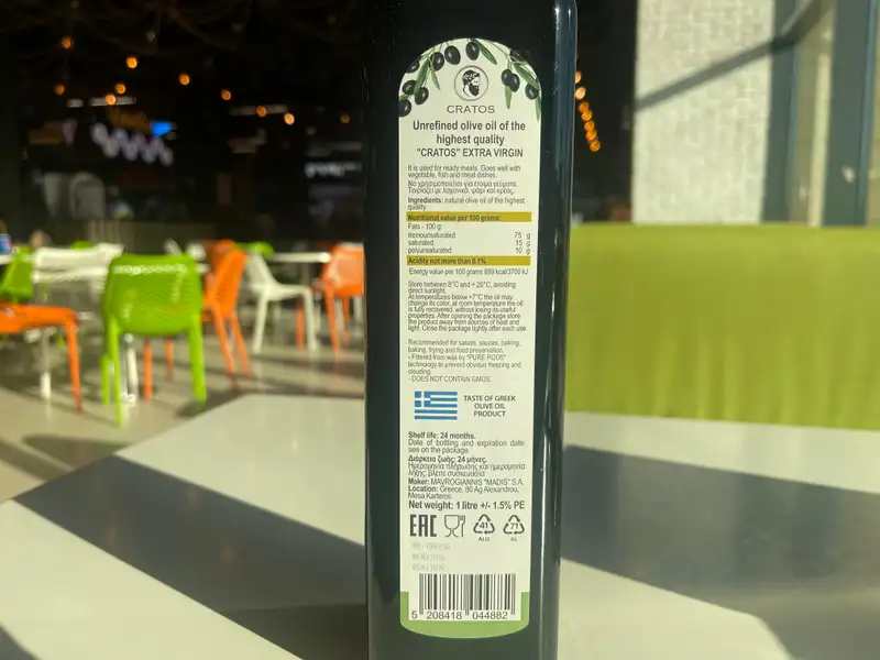 Оливковое масло "Cratos" имело знак ЕАС, что подтверждает его соответствие нормам Таможенного союза, однако на упаковке полностью отсутствовала маркировка на русском и казахском языках, что является нарушением законодательства Казахстана и ставит под сомнение его прозрачность и безопасность.
