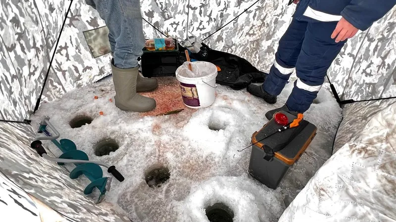 С его слов, неотъемлемая часть зимней рыбалки – правильная экипировка. Теплая палатка, непромокаемая одежда и спасательный жилет здесь не роскошь, а необходимость.