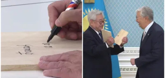 По традициям таеквондо: Токаев расписался на тренировочной доске, а затем разбил ее