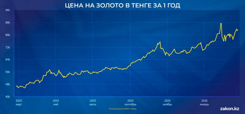 - Год назад, то есть, 26 февраля 2025 года грамм стоил 47 170,64 тенге. За год увеличение составило примерно 76,7%.
