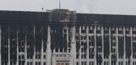 Здание сильно было повреждено во время январских событий. Протестующие подожгли акимат.