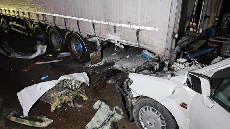 Поздней ночью легковой автомобиль врезался в припаркованную на обочине фуру и от мощного удара на полном ходу залетел под нее. Учитывая, что у Mitsubishi руль расположен с правой стороны, водителю чудом удалось выжить.
