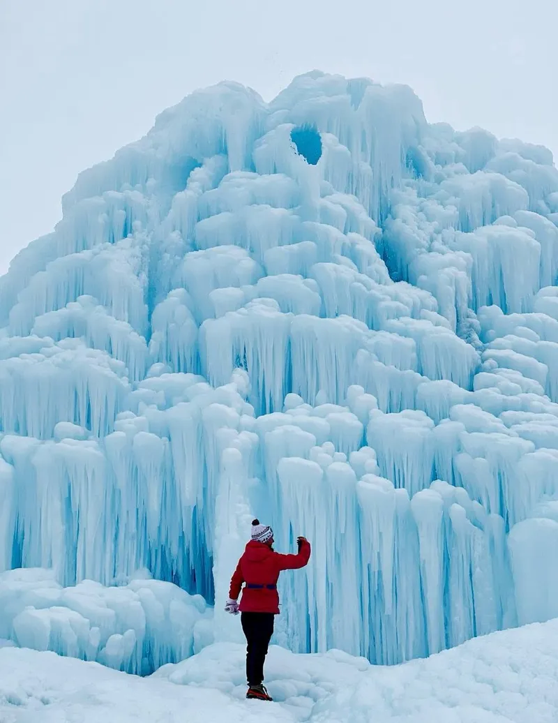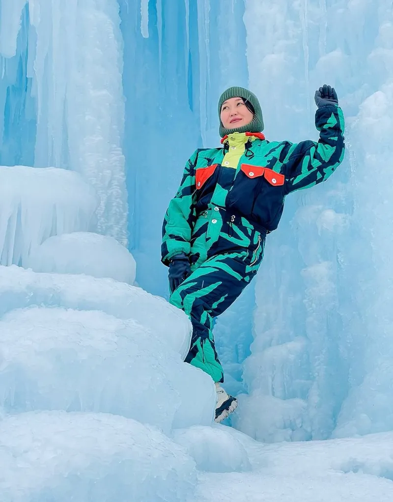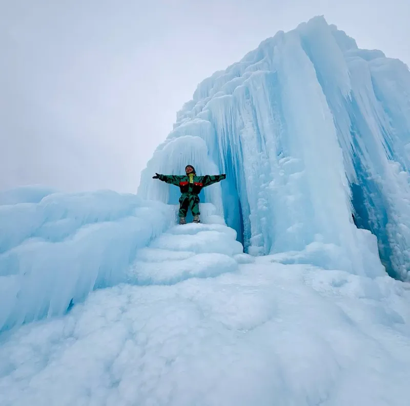 Первой локацией для девушки стал ледяной вулкан в Кегене. Местные поговаривают, что он существует с 90-х годов. В этом году "айсберг" хорошо разросся ввысь и вширь, став очередной диковинкой.
