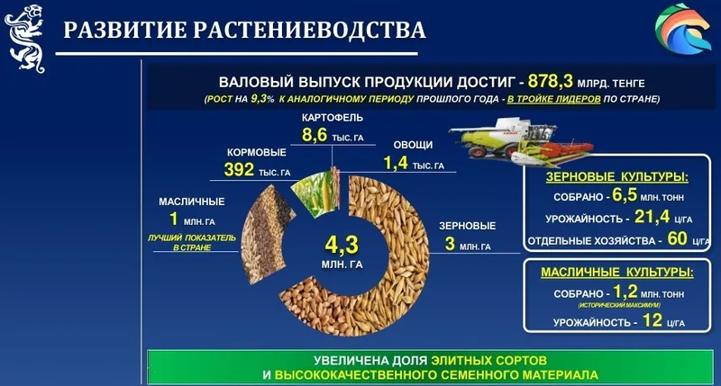 "У нас производится четверть казахстанского зерна, 23,6 % масличных культур и десятая часть молока. В растениеводстве достигнуты высокие результаты: убрано 4,3 млн гектаров, площади масличных культур доведены до 1 млн гектаров – это лучший показатель в стране. В среднем по области урожайность зерновых составила 21 центнер с гектара, валовой сбор достиг рекордных 6,5 млн тонн", – подчеркнул Гауез Нурмухамбетов.