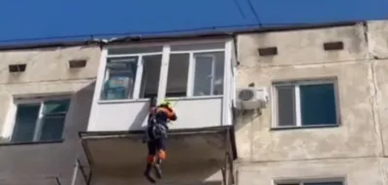 Сотрудники оперативно-спасательного отряда МЧС в присутствии полиции с использованием альпинистского снаряжения проникли в квартиру на четвертом этаже пятиэтажного дома без вскрытия двери.