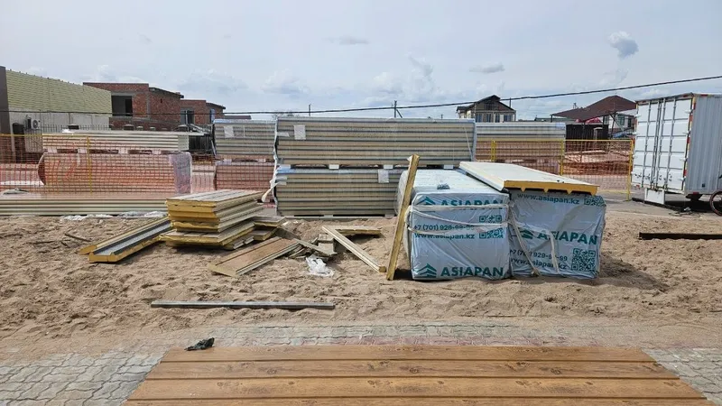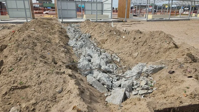 Местами образовались целые "горы" мусора – строительные отходы, обрезки материалов. Другая часть территории занята техникой и временными сооружениями.