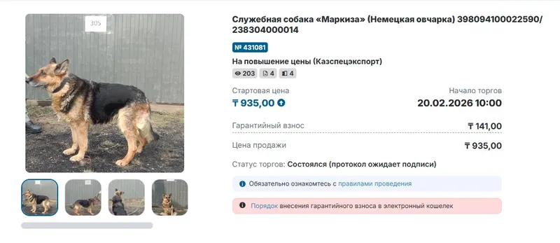В Казахстане сегодня, 20 февраля 2026 года, состоялись торги по живым существам – овчаркам, стоявшим на страже границы и ставшим непригодными для дальнейшей службы, сообщает Zakon.kz.