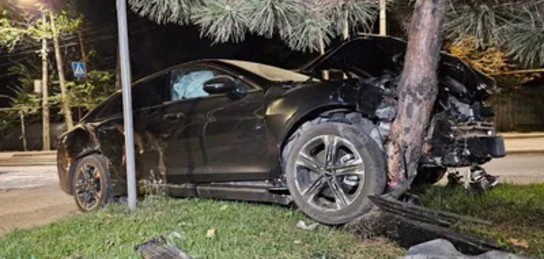 Kia, заскочив на бордюр, врезалась в сосну. Mitsubishi перепрыгнул через тот же бордюр и врезался в забор и стену продуктового магазина.