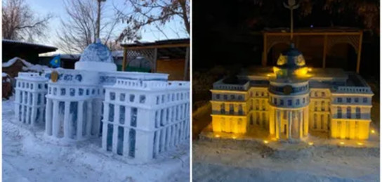 Житель Западно-Казахстанской области у себя во дворе восемь дней из снега лепил точную копию здания Акорды, сообщает Zakon.kz.