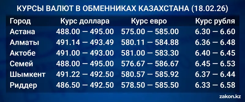 Официальный курс доллара на 18 февраля 2026 года составляет 489,99 тенге. Но на наличном рынке эта цифра – не главный ориентир. В обменниках страны доллар, евро и рубль торгуются с заметным разбросом, а в одном мегаполисе различия ощущаются и между районами, сообщает Zakon.kz.