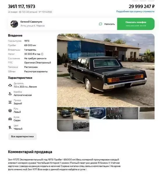 Объявление о продаже редчайшего представителя советского автопрома – правительственного лимузина ЗИЛ-117П появилось 31 января на сайте Auto.ru. Владелец оценил машину в 30 млн рублей.