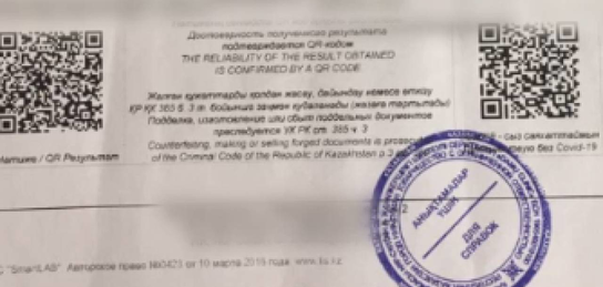 Также, сотрудниками полиции установлен гражданин РК, который находясь за пределами страны, изготавливал и сбывал справки в электронном варианте с отрицательным результатом ПЦР-теста за 5500 тенге.