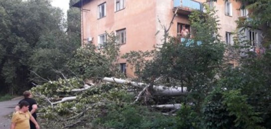 В Турксибском районе Алматы во дворе дома упало дерево, перекрыв проезд между домами и повредив крышу, сообщает Zakon.kz.